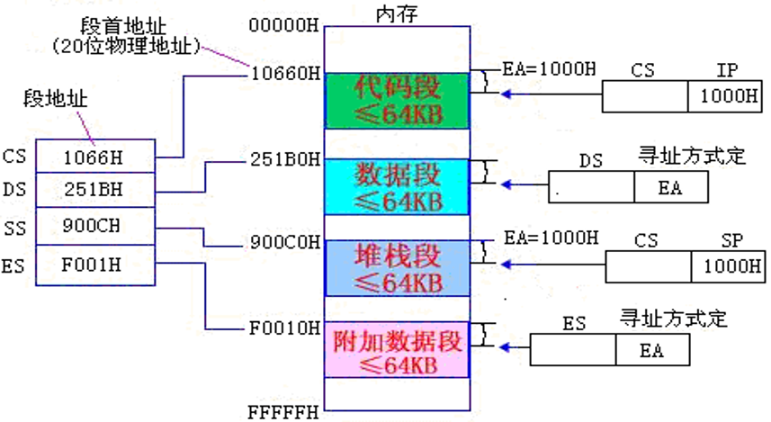 段寄存器分别为CS、DS、SS和ES,段基址存放在这4个段寄存器内。
