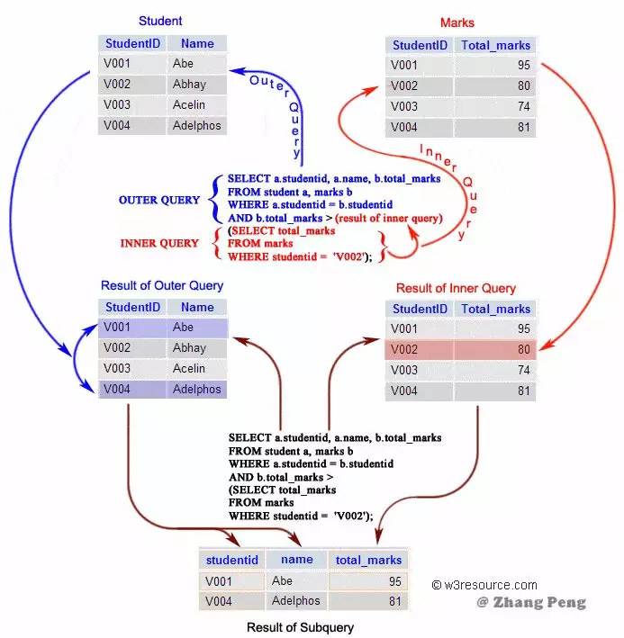 - 内部查询首先在其父查询之前执行,以便可以将内部查询的结果传递给外部查询。执行过程可以参考下图: