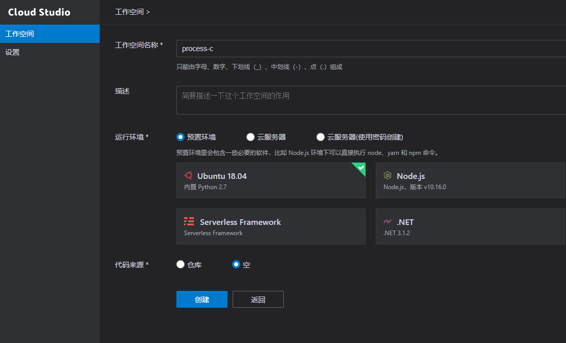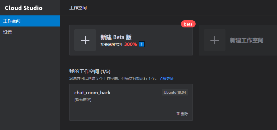点击新建 Bate 版,工作空间名称随便写写,代码来源选空