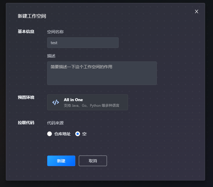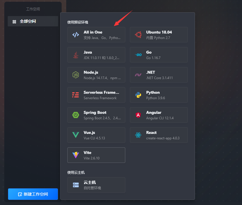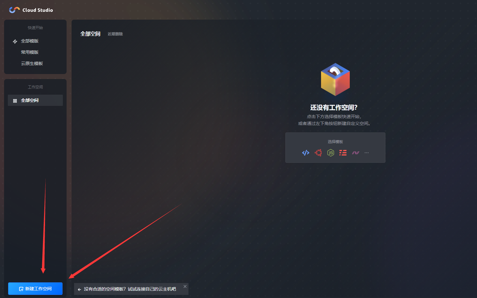 通过注册你已经获得了一个域名:https://你注册时填写的名称.cloudstudio.net/。在后面加上:/dashboard/workspace进入控制面板