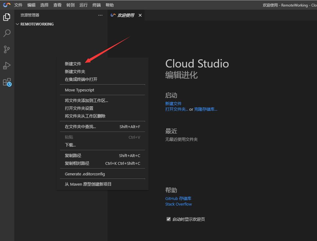 在左侧的:REMOTEWORKING目录下右键,新建文件