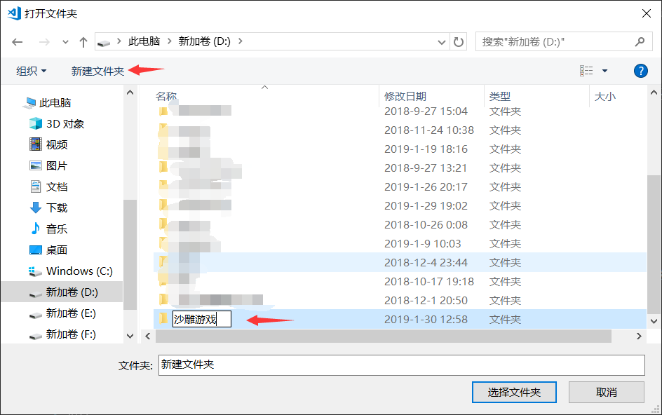 - 找一个你喜欢的位置,新建一个文件夹,写上你喜欢的名字,比如找到D盘——新建一个文件夹——沙雕游戏