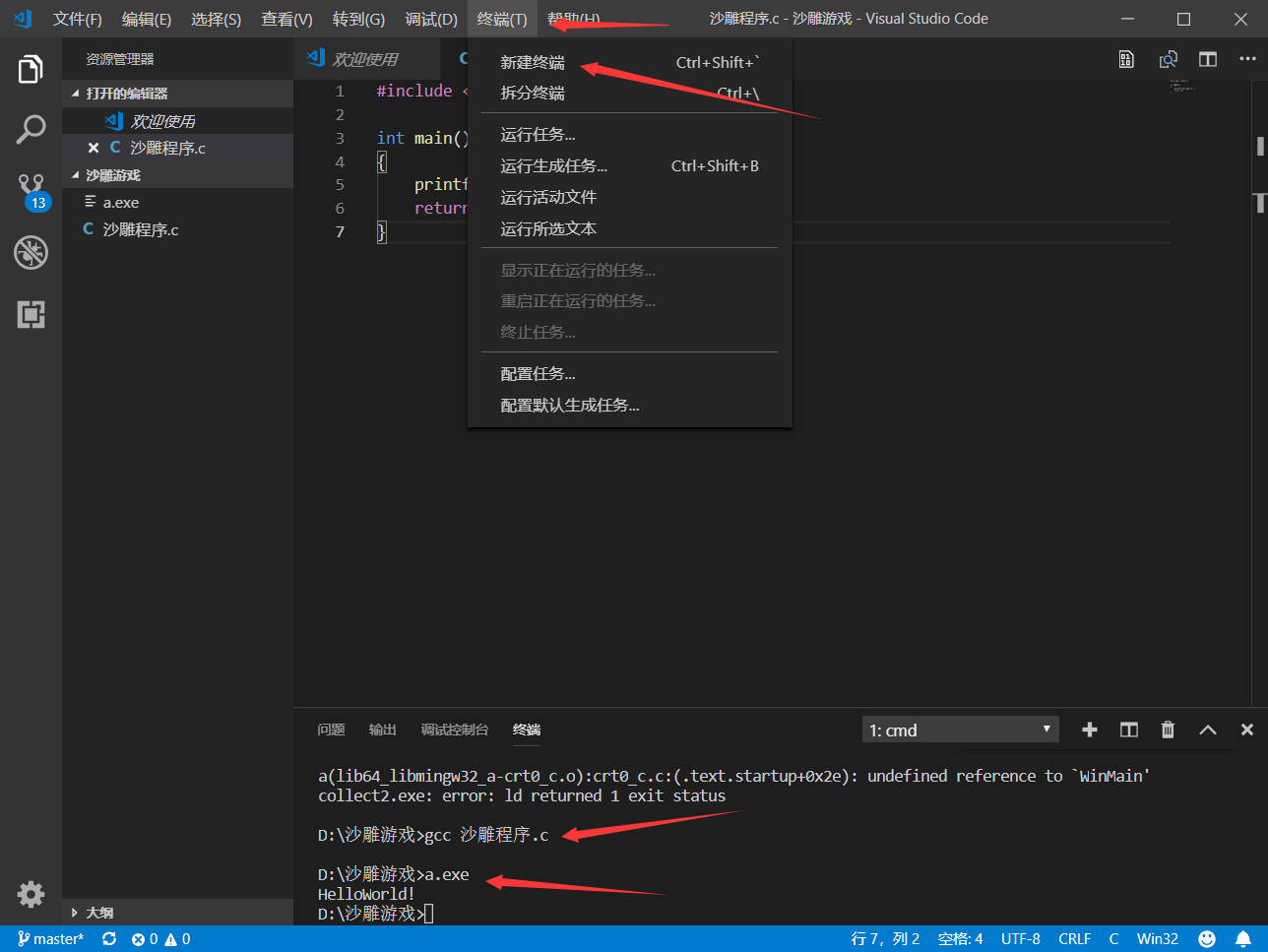 找到 终端 —— 新建终端,输入gcc 沙雕程序.c进行编译,得出一个a.exe文件,直接输入a.exe打开这个程序,终端就会打印出HelloWorld!