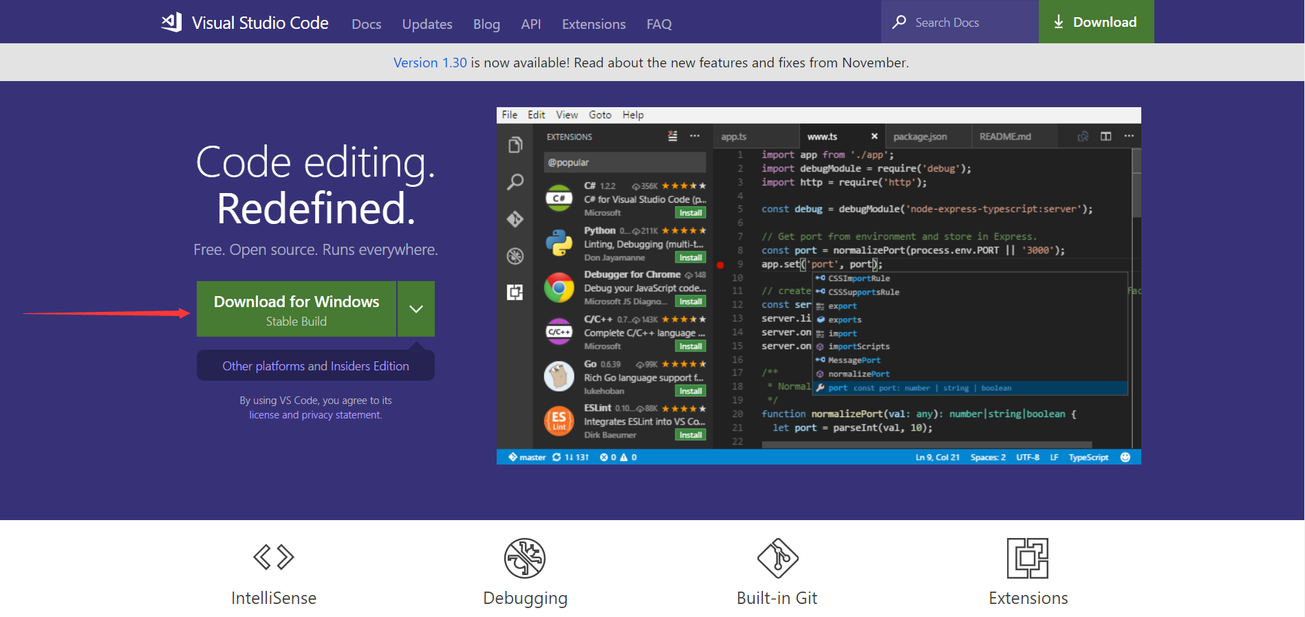 就像我们玩游戏,有时候想玩新的3A大作,但是下载回来后发现 “缺少XXX文件”,这就是因为没有装运行环境造成的(好像跑远了)。总之,这里就教一下如何安装VScode,打开官网,我知道你们懒得百度,直接点开左边的链接就是了。
