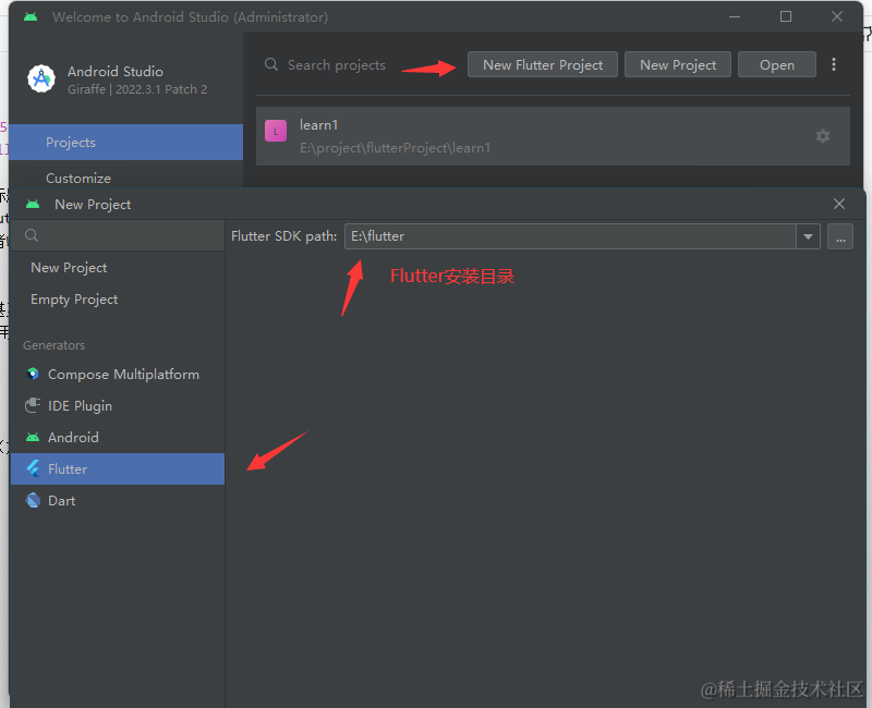 New Flutter Project => 选择Flutter => 选择Flutter安装目录 => 修改项目名称、调整项目目录 => Create!