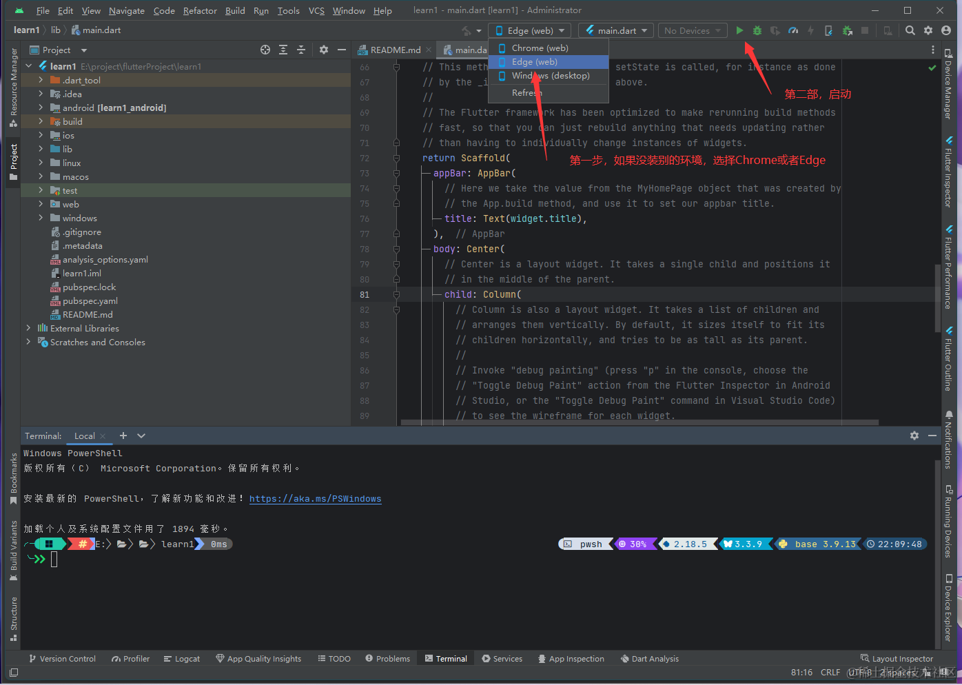 上面提到的环境搭建教程基于安卓和iOS用户来讲解,但是既然看到咱们这个标题点进来的应该大部分掘友都是网页前端开发,那么咱们后续的讲解都以Web的方式来运行Flutter项目啦,所以请各位掘友准备好一个比较新的Chrome浏览器哦,当然对于Windows10或者Windows11的开发者来说,系统自带有新版Edge也可以不需要安装Chrome。